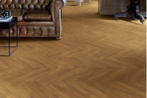 - Вінілова підлога (LVT/SPC). Найкращий вибір для кухні чи ванної. Вініл «ялинкою» виглядає як дерево, але зовсім не боїться води.